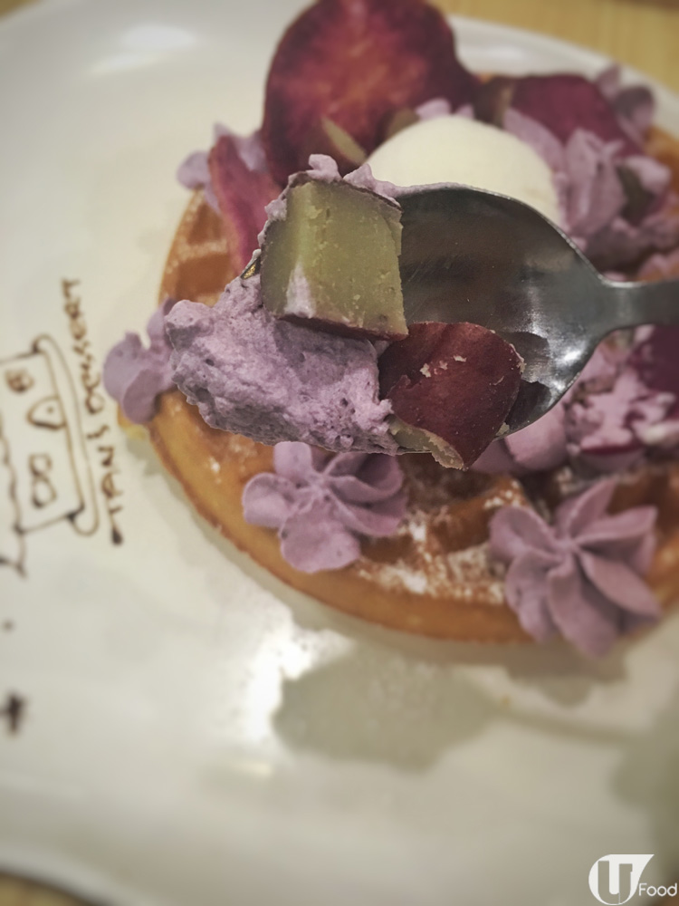 窩夫做得鬆軟,加上忌廉的紫薯味淡淡的,唔會食滯。配上脆身的薯片及薯粒,口感非常豐富,無論紫薯或窩夫迷都啱口味。
