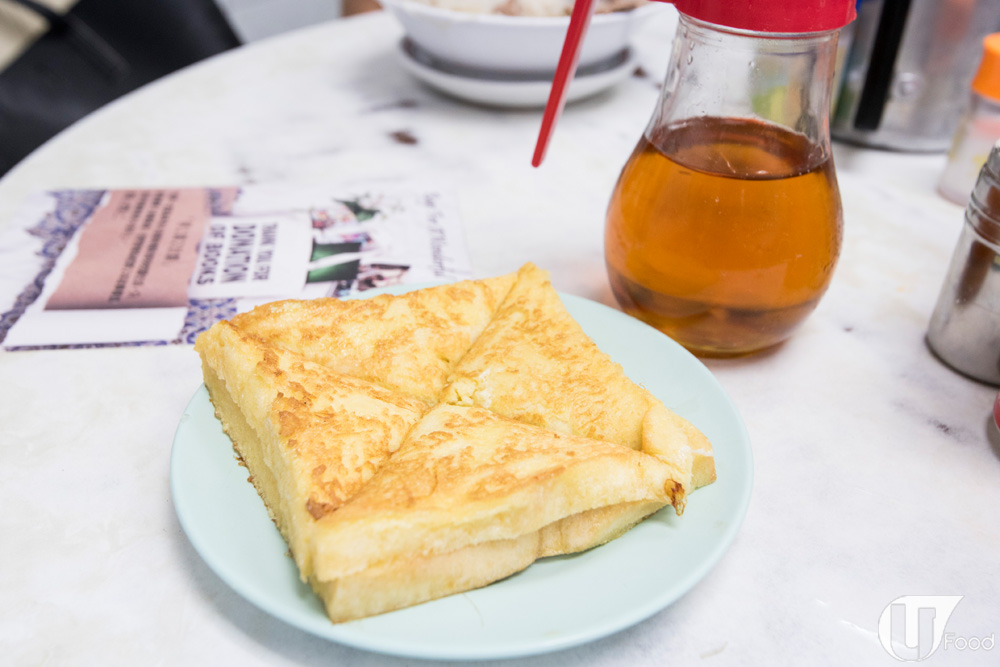 多士中間以雞蛋、鴨蛋、牛油和糖蒸成的甜甜咖央,麵包厚薄適中,蘸蛋漿炸成金黃色,再淋上蜜糖同食,正!