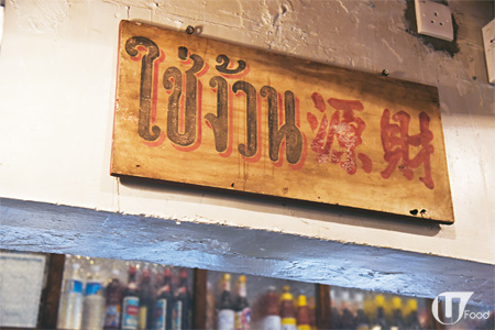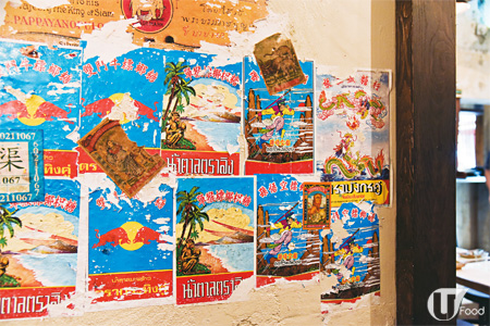 牆身貼上舊泰國產品廣告招紙,增添懷舊況味。
