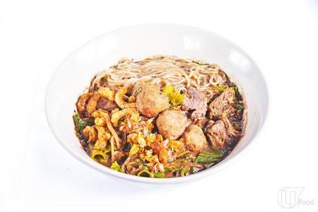 有 M5 澳洲和牛牛肉片、牛腩同牛丸,牛味頗濃厚。配料有香口炸蒜、蝦乾及通菜。深色濃稠的豬骨湯底,加入了蒜頭、老抽、肉桂、椰漿等秘製而成,非常鮮味帶微甜。