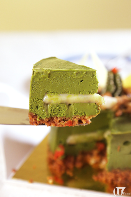 切開蛋糕,原來中間有層糯米糍夾心!煙煙韌韌,而且分量好多,可以拉出來!夾在綠茶芝士蛋糕中作為點綴,加埋脆脆餅底,口感和味道都層次十足,而且綠茶味重,芝士味很輕,吃罷不膩。