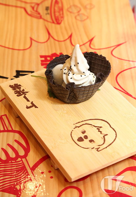 清妹個萌樣真係好打耳呀!甜品仲加入咗黑蒜油豬骨湯味棒丁麵嘅元素。黑色嘅窩夫脆杯其實是黑蒜油味,杯上係自家製作嘅白芝麻軟雪糕,再加多粒黑芝麻流心湯圓,成個甜品好香蒜味和芝麻味,過癮!