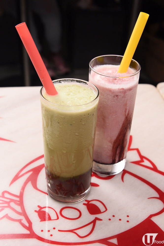 (前)紅豆綠茶鮮奶、(後)藍莓乳酸冰 (跟餐另加 $15)