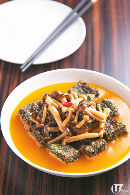即自家製豆腐,豆腐每天用新鮮豆漿和雞蛋撞成,再釀進海苔和青菜炸起,濃郁多汁,連同南瓜蓉吃更香甜。