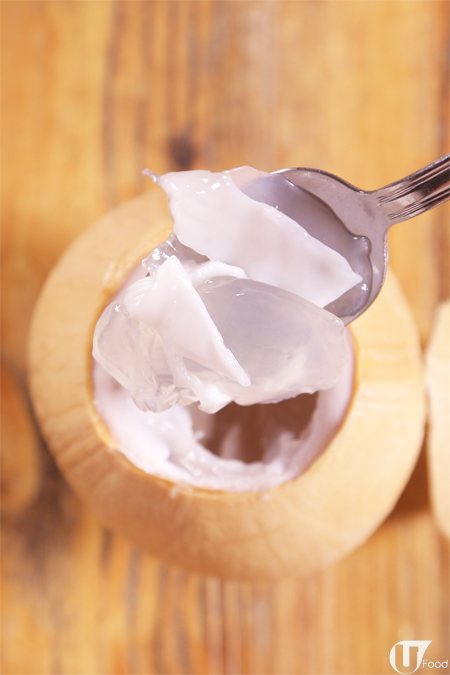 除咗真空密封包裝,外表同普通的椰皇無分別;拆開袋,發現椰皇有個開口,唔使大力用刀劈!輕易揭開,內有乾坤!唔止椰皇水,有用椰皇水製成的啫喱,仲有已挖出的椰皇果肉,係一個甜品!