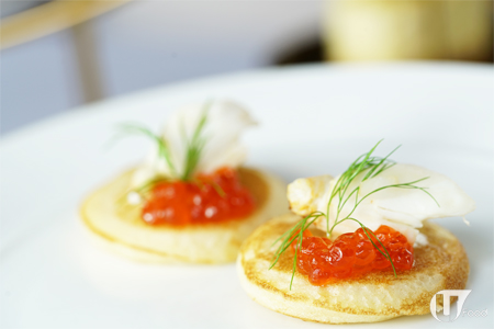 蟹肉三文魚籽配迷你薄餅