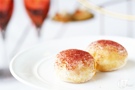 外層灑上紅莓粉,酸酸甜甜,鬆餅中間夾着蘋果醬,一咬開即見驚喜。