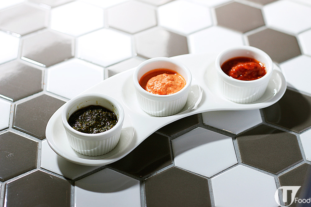 隨芝士火鍋上枱的三款滋味醬,包括意大利番茄香草紅醬、意大利香草綠醬及橙椒醬。店員教路話有 4 步芝味秘笈,叫我們先吃法包粒、薯條、蔬菜等配料,以簡單食材帶出芝士的甘香原味;之後加入紅醬拌勻來品嘗刺身級帶子;輪到加入綠醬,味道跟紐西蘭特級肉眼的夾到絕;最後加入橙醬歎埋菠菜麵,便為之最識食啦!