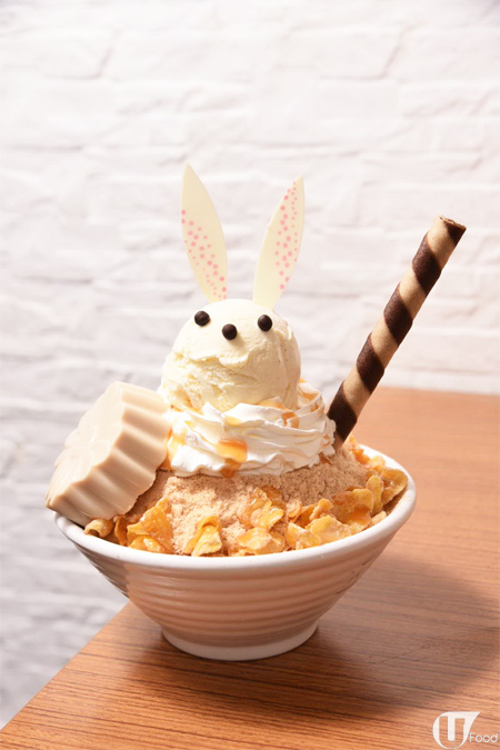 兔仔系列仲有雪花冰!焦糖味雪花冰灑上木糠粉,旁邊圍滿粟米片,口感好脆。自家製嘅布甸,焦糖味非常香濃,滑溜溜。