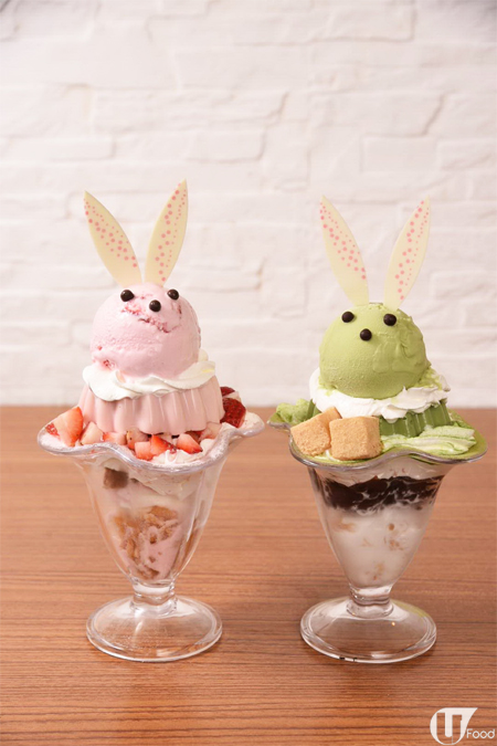 (左)小兔仔紅鑽草莓布甸芭菲 $68、(右)小兔仔綠叢林抹茶布甸芭菲 $68