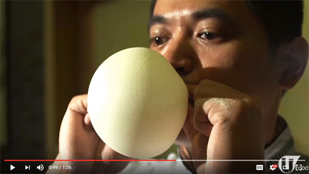 國內的「尚香」在北京、廣州上海約有 30 間,其江蘇靖江店更曾登上《舌尖上的中國》,品牌最引以自豪的是傳統的湯包皮,圖中是老闆孫先生,為表達包皮的韌性,他將空氣吹入麵皮裏,吹到大大也不會破。(《舌尖上的中國》截圖)