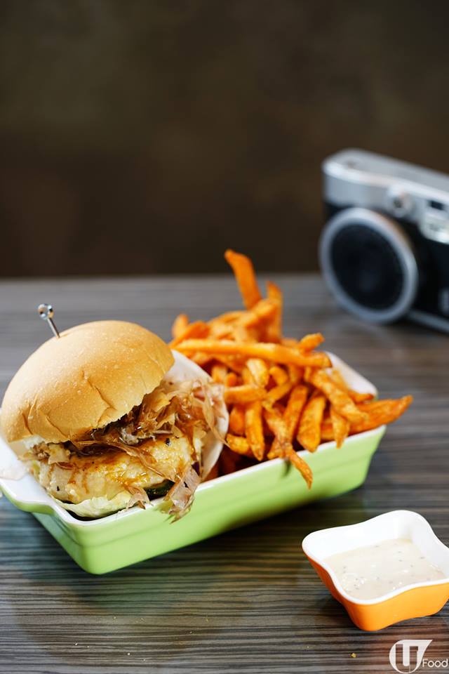 (加 $15 連薯條及飲品)漢堡扒用上六成龍脷柳和四成墨魚滑每天用力撻成,每天產量有限。煎香後再加入鰹魚花、日式燒汁、番茄、青瓜等,有點像吃章魚小丸子!