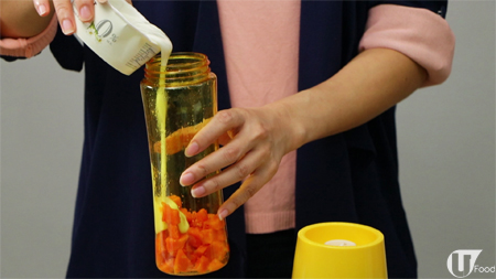 02》 將木瓜加乳酪以 1:3 比例,倒入攪拌機。