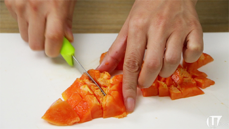 01》將木瓜去核,切開成粒狀。