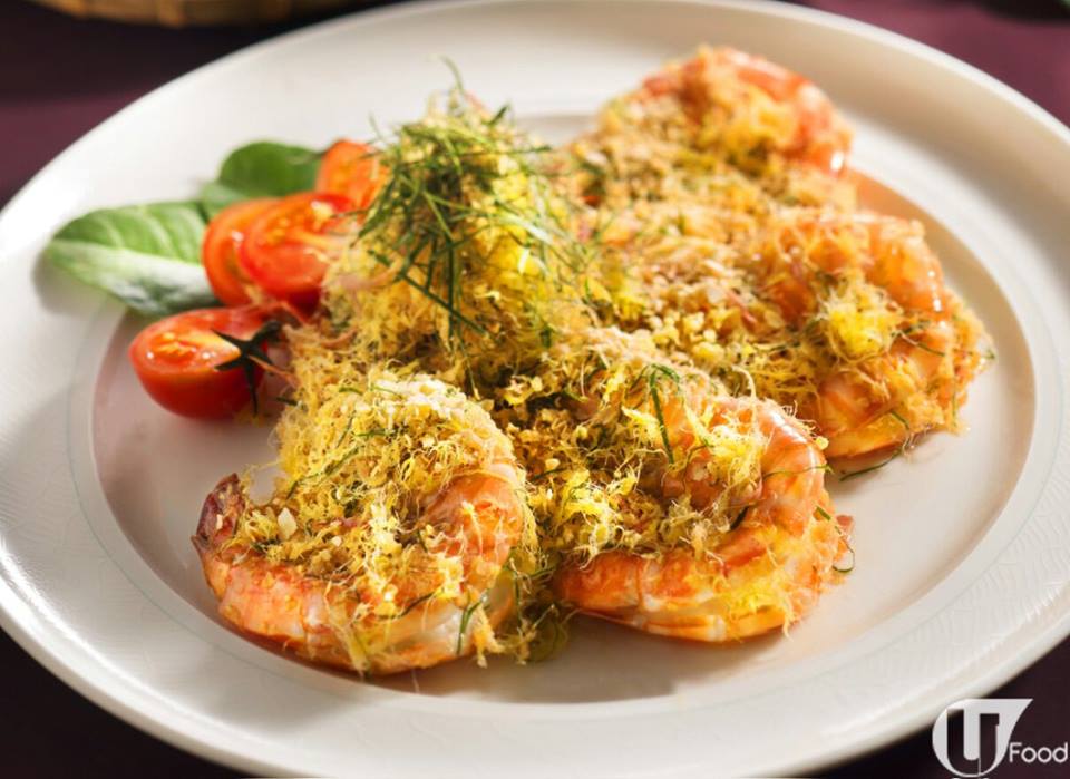 接着是麥皮金絲蝦,所謂「金絲」,乃把蛋汁以慢火快炒成細絲狀,極考炒功與火候。將金絲、麥皮、牛油和原隻大蝦同炒,不但賣相出色,且香脆惹味,堪稱是色香味俱全的新穎菜式。