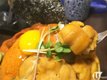 唔好以為平咗,舖頭一定將貨就價;記者親試,實物與宣傳相符,3 款海膽鋪滿整碗飯,睇唔到飯!中間仲有隻鵪鶉蛋黃,有種滿到瀉感覺。海膽質感夠挺,唔會變成糊狀,亦沒有腥臭味,證明夠新鮮。3 款海膽各食得出不同鮮味和個性,北海道海膽香甜中帶海水味,加拿大海鮮夠大瓣,韓國海膽則柔滑淡口,層次感十足;拌埋鵪鶉蛋黃吃,滑溜溜。