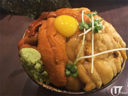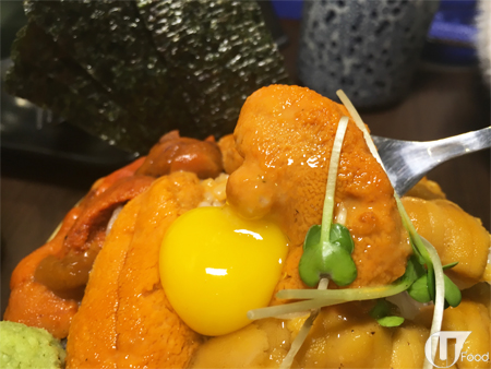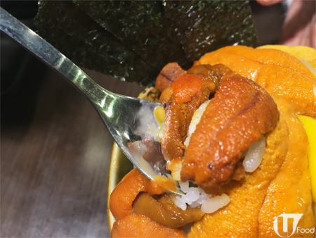 三色海膽飯劃分三個「區域」,由淡口的韓國海膽開始食,之後到中間的加拿大海膽,最後是味道最濃郁的北海道海膽,千祈唔好撈埋一齊!最好是先以匙羹,續一試味,再用紫菜包住嚟食,之後再拌米飯食,就食到最多層次。