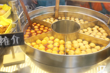 鐵皮車仔上面,放咗一個 6 格嘅爐,入面浸住好多大大粒嘅 魚蛋,分別有 原味、咖喱、沙茶、麻辣及 海苔味。