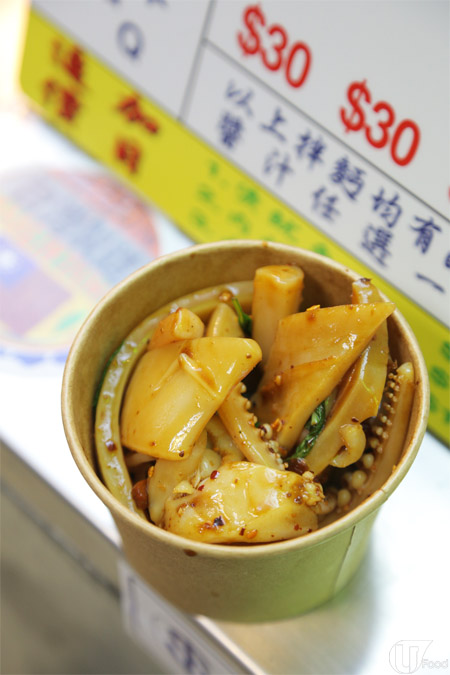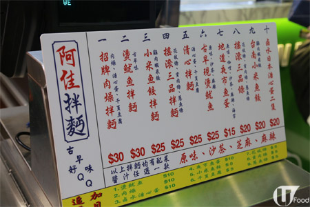 只賣 10 款食物,價錢由 $15 至 $30 不等,主要是魚蛋、拌麵及現燙魷魚為主。拌麵係主打,有 5 款選擇。「 清心拌麵」即是滷水蛋加千頁豆腐、「 搖滾三品」就有花枝條、貢肉條及葱魚條,另有 雞肉蝦米餃、 燙魷魚及 招牌肉燥拌麵。每款拌麵都可以揀原味、沙茶、芝麻及麻辣醬汁。仲有 9 款配料可以追加,$5 至 $10 就交易。