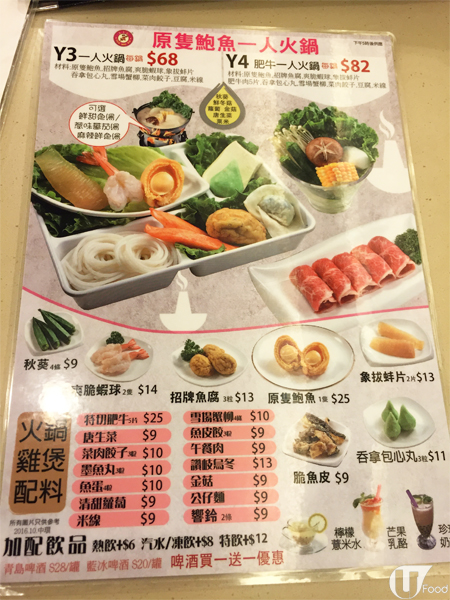 今個秋冬,去「魚米家」唔使獨沽一味食魚湯米綫!米綫店賣火鍋,魚米家唔係第一間,但估唔到佢有原隻鮑魚一人鍋!呢個原隻鮑魚火鍋系列有兩款選擇,$68 有 原隻鮑魚、招牌魚腐、蝦球、蔬菜拼盤等 10 款配料,貴 $30 就有多 5 片肥牛。另外仲可以追加 肥牛、魚蛋、魚皮餃、餃子、響鈴等 21 款火鍋配料,最平$9、最貴嘅鮑魚和肥牛等則是 $25,選擇唔少得過 火鍋店㗎。