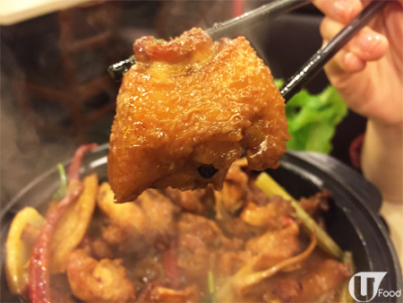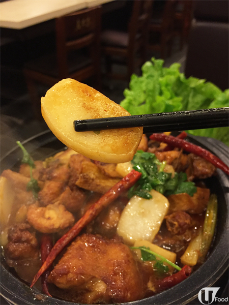 雞件數目唔少,而且預先爆炒過,煎過嘅雞皮滲出雞油,令雞件更甘香惹味,不過加埋煲底嘅辣酒,有點油膩。
