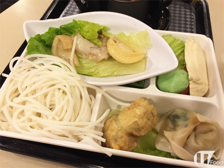 火鍋配料有原隻鮑魚、招牌魚腐、蝦球、象拔蚌片肥牛 5 片、吞拿魚包心丸、雪場蟹柳、菜肉餃、豆腐、米綫及蔬菜拼盤。