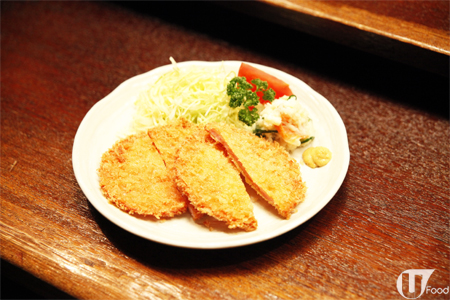 (1) 將火腿依序裹上麵粉、蛋液、日式麵包粉,並在 170°C 的熱油中油炸,取出後適度瀝乾。