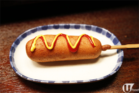 (2) 將香腸串上竹籤。可切成適當長度,以免油炸時長度過長。將魚腸裹上步驟製作的麵 (1) 團,並用 165°C 至 170°C 的熱油炸約 3 分鐘,瀝乾。