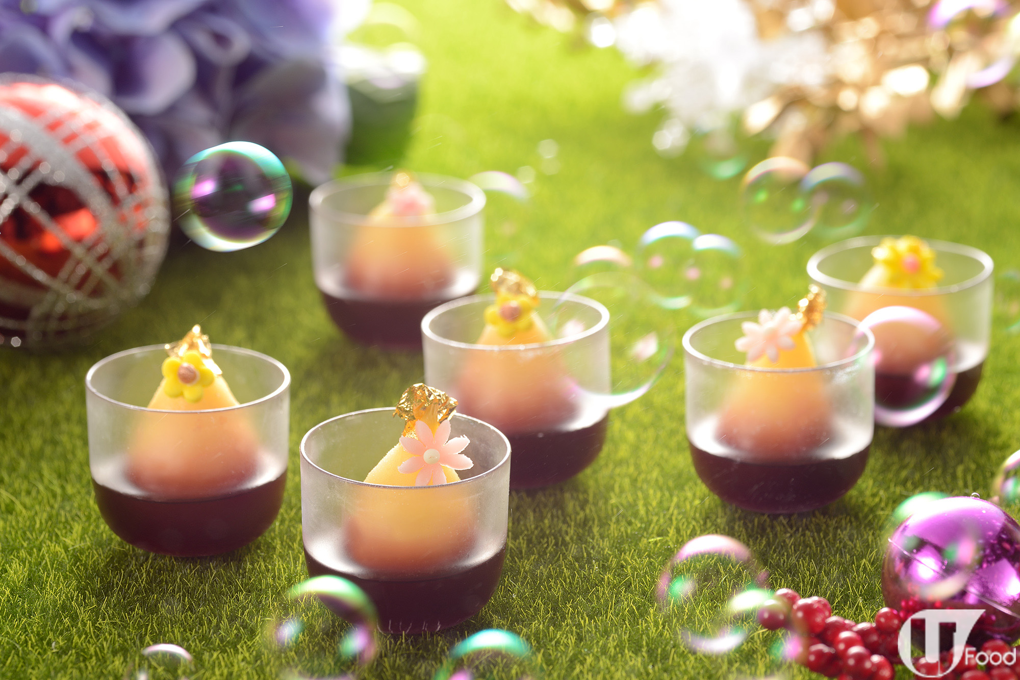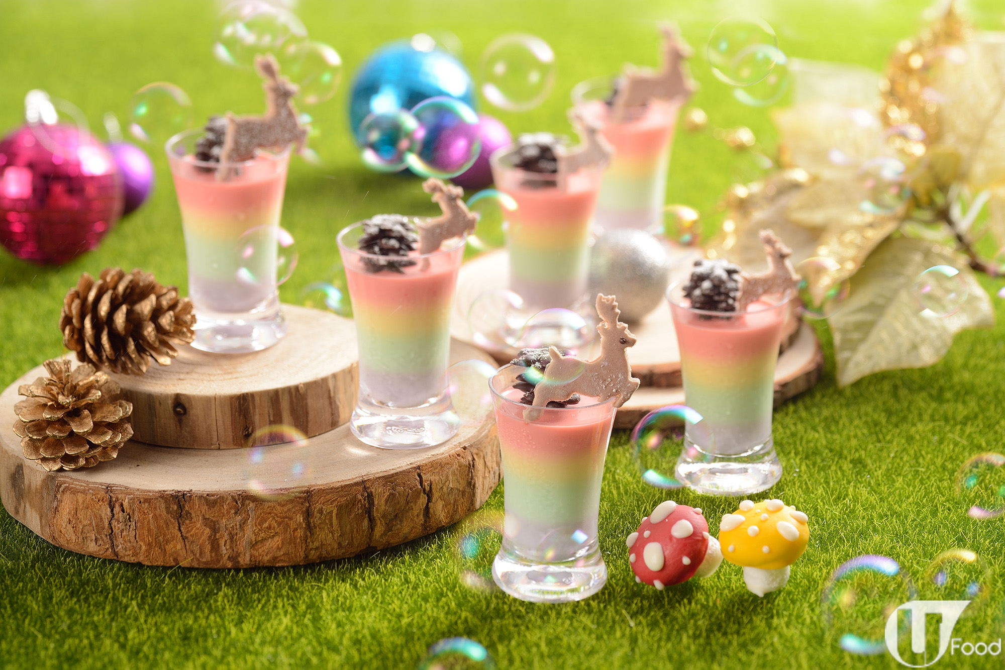 聖誕大餐,當然少不了甜品啦!薈景亦提供一系列精緻奪目的甜品。仙子彩虹奶凍,為客人帶來色彩繽紛的嫩滑奶凍,當中包括士多啤梨、芒果、開心果和藍莓,層層放送,同時讓你嚐盡多款滋味。由於烹調時需要先讓底層凝固,才能製作上一層,因此每個奶凍都製作需時,絕對是心機之作。