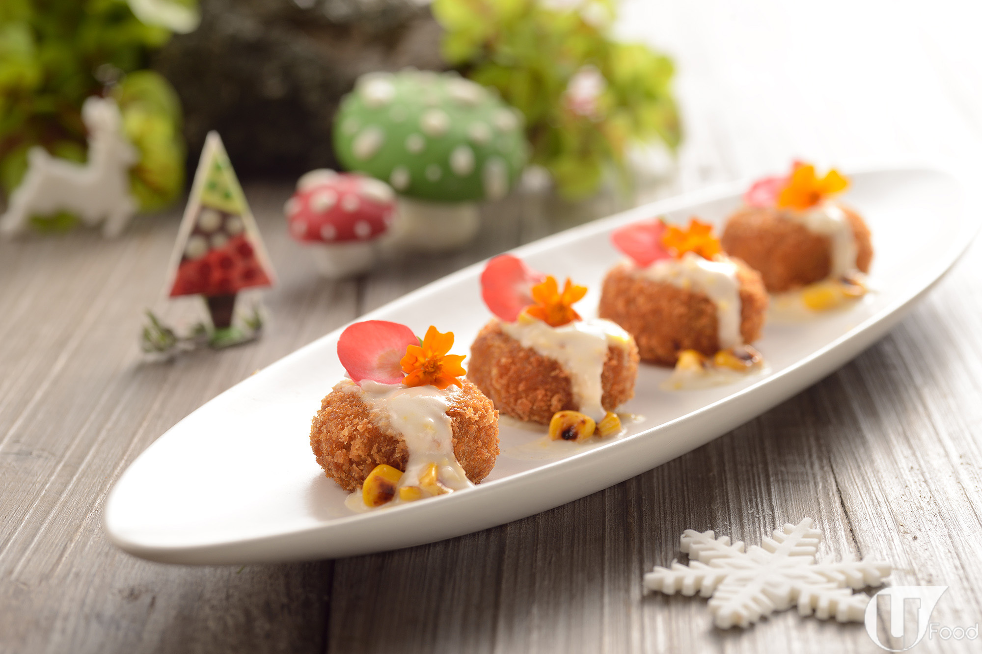 大廚精選加拿大螃蟹,以蟹味濃郁見稱,先用香芹碎和香菜為蟹餅調味,然後將其半煎炸,形成香脆口感,佐以清甜粟米汁,與蟹餅的鮮味互相輝映。
