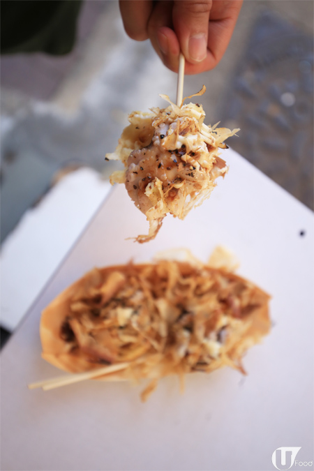 原隻章魚仔放落粉漿烤成 「真.章魚燒」,原隻特別有咬口,但粉漿略嫌薄身。(同攤位小食 $40/ 款、$60/ 兩款)