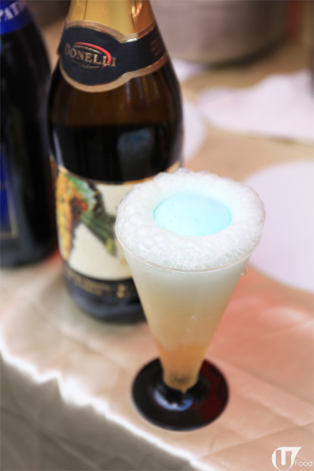 用意大利查馬釀造法釀製的 0 度酒精香檳,配上日本石門島雪鹽製造雪糕,香檳有好香蜜桃及白葡萄味,配上藍色外表雪鹽雪糕,連小朋友都食得,因為無酒精嘛!