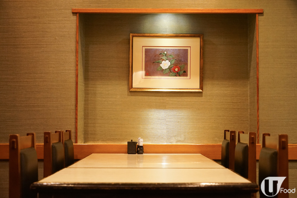 典型日本料理老店格局,簡約木系,牆畫角落甚具和風氛圍。