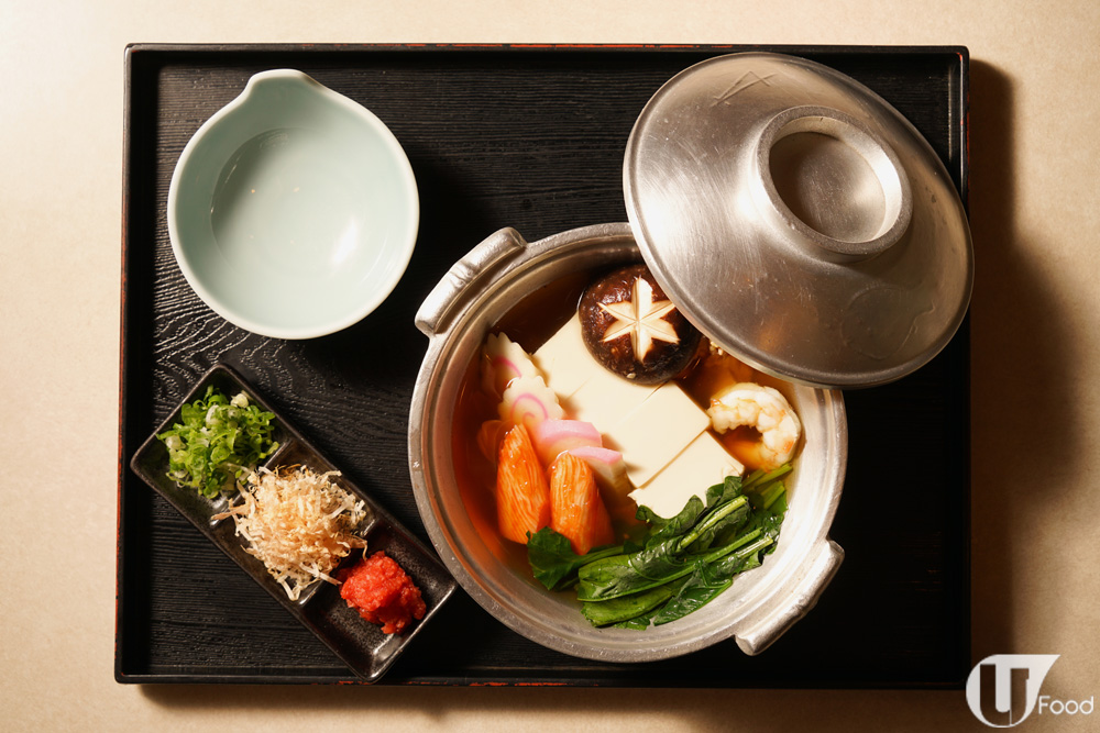 豆腐黃豆味重,滑溜得入口即融。皇帝蟹柳蟹味濃又柔軟,還有中蝦和日本菠菜。將吞拿魚絲、辣蘿蔔蓉及日本葱放於木魚湯內拌勻吃,更提升辛香。