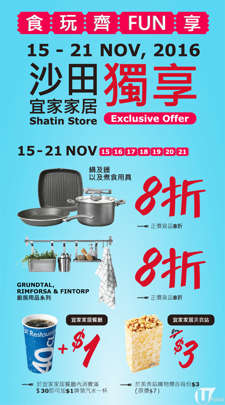 大家最愛行嘅 IKEA 亦有 jetso! 沙田店由即日至11 月 21 日有個獨享優惠!除咗廚具 8 折,去餐廳食夠 $30 就可以加 $1 換杯汽水,美食站嘅爆谷(原價 $ 7/ 小)亦減價到 $3 就有一份,好平呀媽!