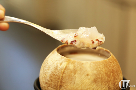 首推椰皇燉奶配高纖燕麥,在椰皇裏有勁滑燉奶,仲有高纖燕麥、西米同燉,味道有啲似食椰奶麥皮,刮埋椰皇肉食,滋潤得來又飽肚。