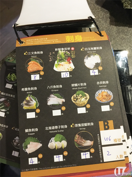 放題幾個入座時段,每個時段收費不同,但吃的東西大致相若。小記揀選最平的時段,每位 $178,包日食放題和蒸氣鍋。放題採剔紙仔形式,數量按柯打上桌,柯打後好快有食物上枱,亦好少出現漏單情況。