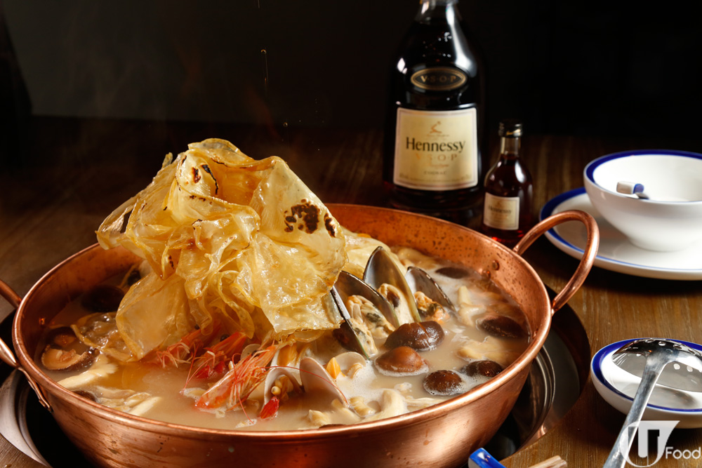 腐皮包着有用干邑浸足一晚的炒雜菌,再配上軒尼詩拔蘭地湯底,現場點火仲見到火焰效果,酒精揮發,卻留下餘香,過癮。