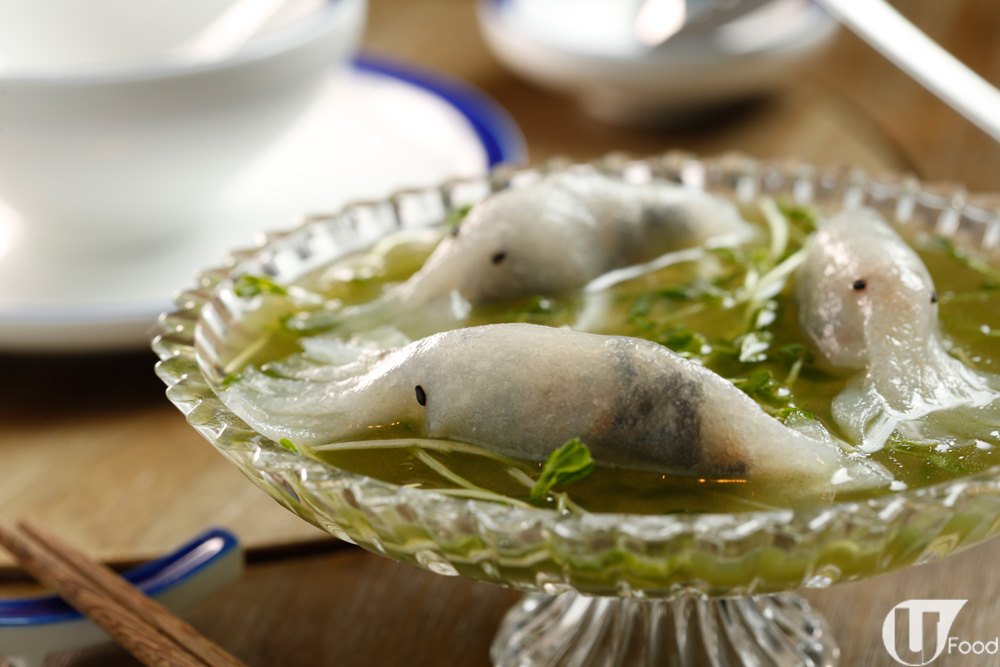 個名勁搞鬼!其實係上湯浸魷魚造型粉卷,外皮做得晶瑩剔透,魷魚肉好咬口,配蘿蔔絲、黑松露提味,好香。