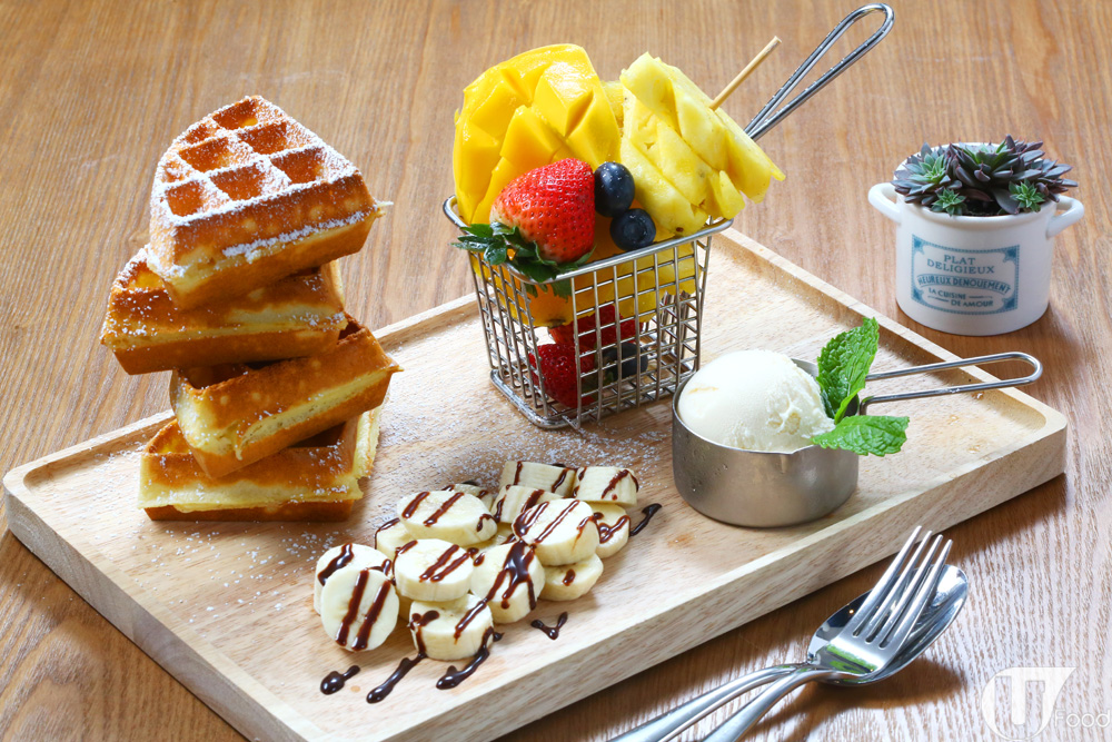 即叫即做的窩夫,熱烘烘上枱時飄來濃濃的蛋奶芳香,已叫人垂涎,大廚為了令窩夫的口感更豐富,特意在中筋麵粉中混入高筋麵粉,令窩夫的口感鬆化又帶香脆,配上芒果、香蕉等鮮果,中和窩夫的甜膩度。