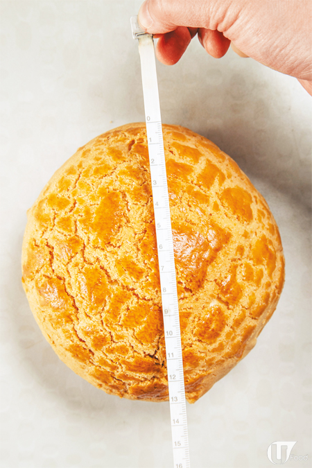 既然以前出品的牛角包、法包都不甘平凡,試問菠蘿包又點會失色?Fiona 想做有餡款式,卻發現一般菠蘿包不夠大,於是尋找麵包店訂造特大菠蘿包,試過不同 size,最後敲定半磅重,包面直徑有成 13 厘米,size 是一般菠蘿包的 2 倍或以上,要雙手捧起先食到,單睇樣已震懾全場。巨型菠蘿包不論質感及味道,都跟平常的無異,有柯打時會先烘焗,入口暖笠笠。