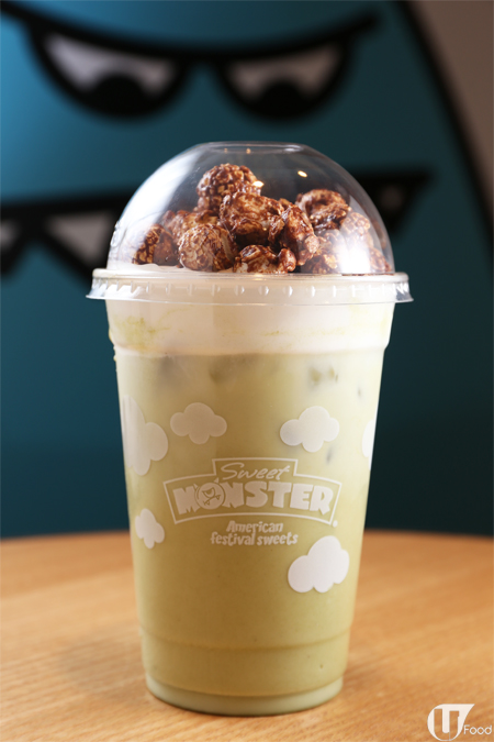 如果你 order 熱飲,店子會送你 Sweet Monster 曲奇餅 1 塊;凍飲就會喺飲品上面加上不同口味嘅爆谷!綠茶顏色偏淺,味道亦偏淡,跟送朱古力爆谷!