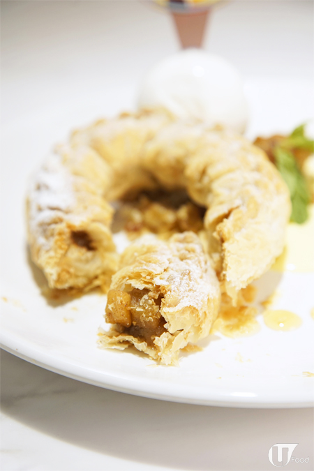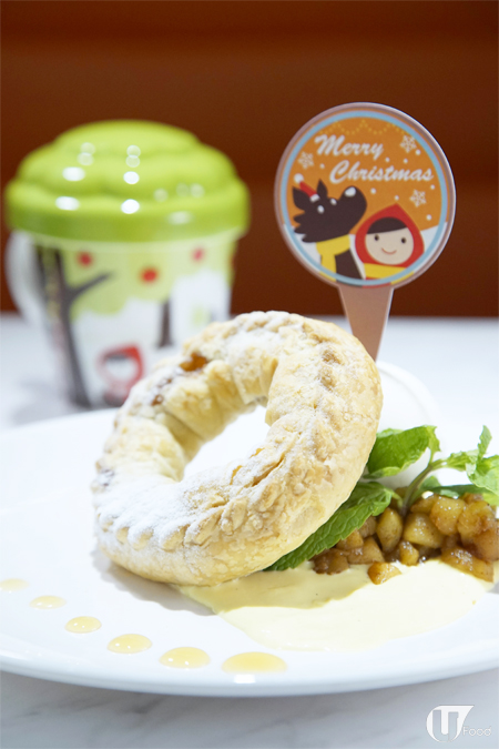 甜品師先將新鮮青蘋果、提子乾,加黑朗姆酒及肉桂煮過,再用酥皮捲成聖誕花環狀,唔會食到論論盡盡!