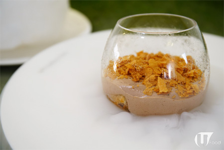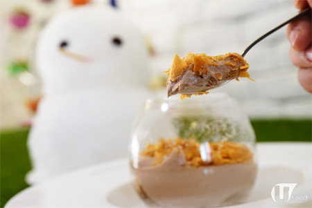 雪人底下除了有乾冰外,還有一杯榛子 Mousse。上面灑上薄脆,底層則是手指餅,吃起來味道有點似金莎,甜而不膩。