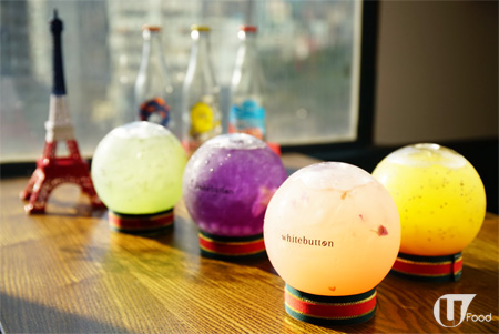 4種顏色飲品味道分別係(左起)橙色是 芒果、桃及羅勒子;粉色是荔枝、玫瑰花及乳酸爆珠;綠色的是 青蘋果、檸檬、薄荷加羅勒子;紫色是 碟豆花柚子。只需倒轉,扭開蓋,將飲品放在蓋上就可慢慢歎。