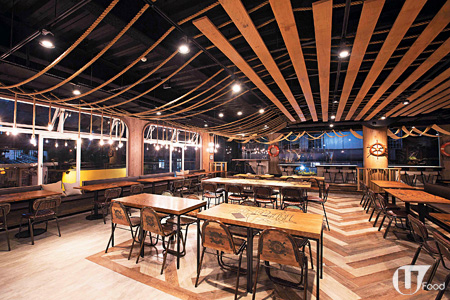 店內空間逾三千平方呎,約有 80 個座位,很闊敞。店內模擬海賊船的船艙,裝潢走 Loft 工業風,除了加入如古代船上的布幔、巨大船型枱和繩索吊燈等場景細節,還有不少 One Piece 元素如懸賞海報等,讓粉絲們慢慢發掘!