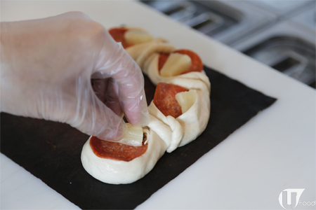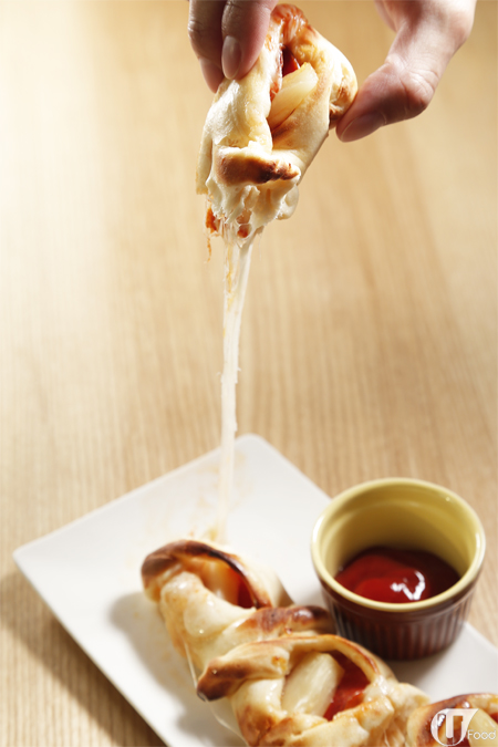 長條型捲餅,像麵包般鬆軟又 Chewy,餡料有菠蘿、辣肉腸及 Mozzarella cheese。
