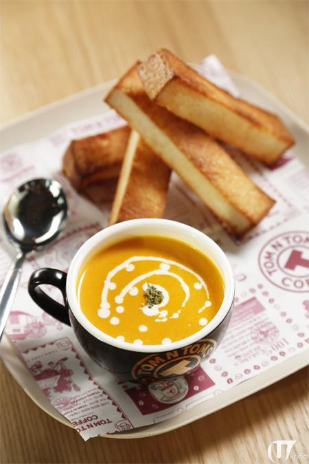 將新鮮南瓜打蓉煮湯,質感細滑,配塗牛油烘脆的多士條食,輕輕巧巧可當一餐。