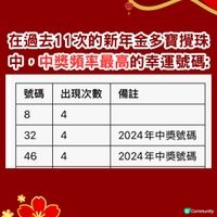 香港六合彩頭獎再度飆升至1億港元,將於2026年1月3日(周六)晚上舉行新年金多寶攪珠,特別設立7,500萬元金多寶基金。若以每注10元獨中頭獎,預計頭獎金額可高達1億元,為市民帶來新年橫財機會。新年金多寶彩票現已開始發售,為方便大眾有更多時間購買,本周二(12月30日)晚上及元旦(1月1日)均不會進行六合彩攪珠。即刻睇新年金多寶開出次數最多號碼>> 來源:賽馬會 #中獎號碼#六合彩#新年金多寶#攻略