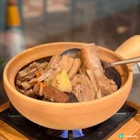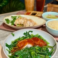 必食海南雞鑊仔飯($368),鑊仔飯上桌時有塊鋪滿蔥薑蒜、班蘭與香茅的竹網,店員會即席取走竹網,再加入蔥油及醬油,拌勻後才下雞件。雞油飯滿佈牡丹蝦乾、芋頭及臘味粒,雞件相當嫩滑,鑊邊亦有焦脆的飯焦,附帶的沾醬也風味十足。